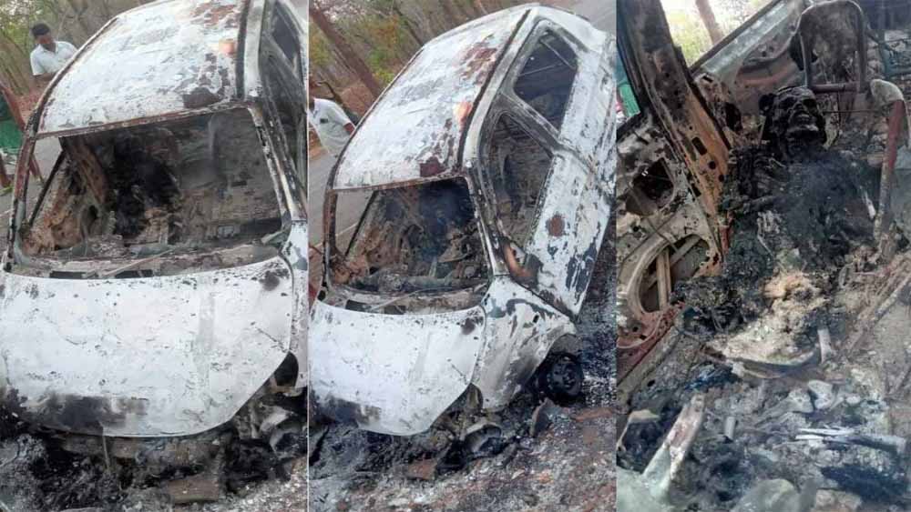 तेज रफ्तार कार अनियंत्रित होकर गड्ढे में गिरी, लगी आग, जिंदा जला ड्राइवर