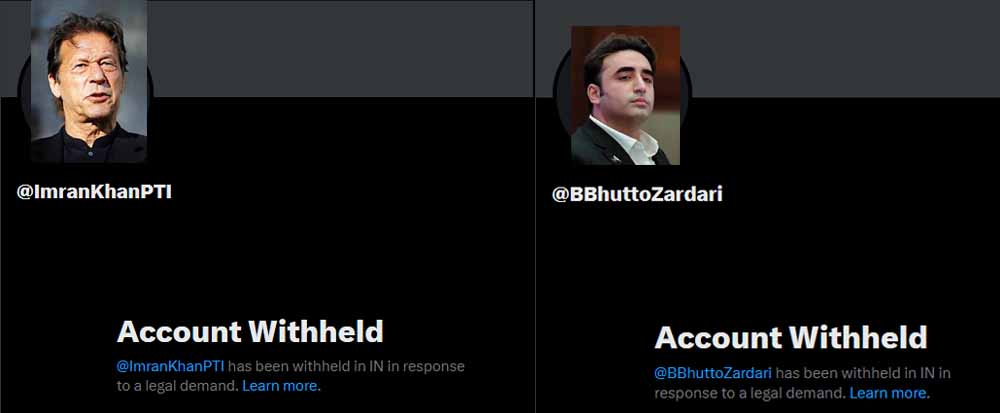 इमरान खान और बिलावल भुट्टो के 'एक्स' अकाउंट पर एक संदेश लिखा हुआ सामने आ रहा है। इसमें लिखा है कि कानूनी मांग के जवाब में इसे भारत में रोक दिया गया है। पाकिस्तानी राजनेताओं के एक्स अकाउंट की प्रोफाइल पिक्चर और कवर इमेज ब्लैंक (खाली) दिख रही है।