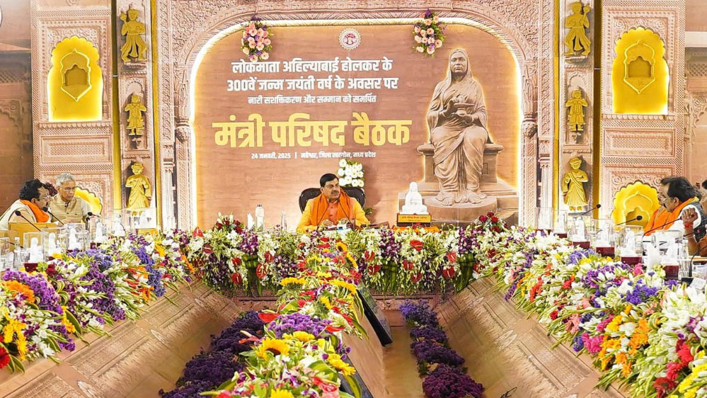 मुख्यमंत्री डॉ. मोहन यादव ने कहा है कि लोकमाता देवी अहिल्या बाई की 300वीं जयंती के उपलक्ष में मंत्रि-परिषद की बैठक का आयोजन माँ नर्मदा के किनारे होल्कर शासकों की राजधानी रहे महेश्वर में किया गया। देवी अहिल्या माता हों या रानी दुर्गावती, दोनों ने ही विदेशी आक्रांताओं के विरुद्ध संघर्ष के साथ सुशासन स्थापित करते हुए नारी सशक्तिकरण के अनुपम उदाहरण प्रस्तुत किए। प्रधानमंत्री नरेन्द्र मोदी के मार्गदर्शन के अनुसार गरीब, युवा, अन्नदाता और नारी सशक्तिकरण के चार स्तंभों पर आधारित व्यवस्था के अंतर्गत मंत्रि-परिषद की बैठक में महिला नीति संबंधित विषय पर महत्वपूर्ण निर्णय प्रस्तावित हैं। शराब, सामाजिक बुराई है, इससे पारिवारिक स्तर पर समस्याएं होने के साथ ही समाज में कई प्रकार की समस्याएं उत्पन्न होते हैं, पारिवारिक और सामाजिक हित में 19 धार्मिक नगरों और ग्राम पंचायतों में शराबबंदी के संबंध में निर्णय लिया जा रहा है। मुख्यमंत्री डॉ. यादव मंत्रि-परिषद की बैठक से पहले मंत्रि-परिषद के सदस्यों को संबोधित कर रहे थे।