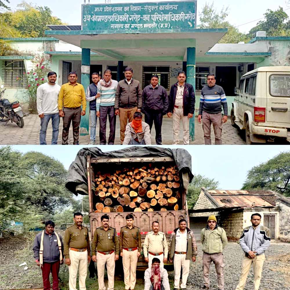 मंदसौर जिले के गरोठ थाना अंतर्गत मुखबिर की सूचना पर 3 फरवरी को अवैध खैर की लकड़ी की तस्करी के विरूद्ध वन और पुलिस विभाग द्वारा संयुक्त कार्रवाई की गई। अवैध खैर की लकड़ी ट्रक में भरकर दिल्ली की ओर ले जायी जा रही थी। सूचना को गंभीरता से लेते हुए वन संरक्षक उज्जैन श्री आलोक पाठक, वन मंडलाधिकारी श्री संजय रायखेरे के मार्गदर्शन में उप वनमंडलाधिकारी गरोठ और वन परिक्षेत्र अधिकारी भानपुरा के नेतृत्व में वन विभाग की टीम और गरोठ पुलिस की टीम ने तत्काल संयुक्त मोर्चा संभाला। शामगढ़ नाका और फोरलेन-एटलेन चौकड़ी पर सघन घेराबंदी की गई। घेराबंदी देख ट्रक चालक ने वाहन को बर्डीया अमरा के रास्ते भगाने का प्रयास किया, लेकिन संयुक्त टीम ने सूझबूझ का परिचय देते हुए घेराबंदी कर ट्रक को रोक लिया।