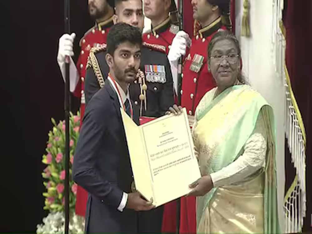 दो ओलंपिक पदक जीतने वाली निशानेबाज मनु भाकर और शतरंज वर्ल्ड चैंपियन डी गुकेश शुक्रवार को राष्ट्रीय खेल पुरस्कार समारोह में राष्ट्रपति द्रौपदी मुर्मू से जब मेजर ध्यानचंद खेलरत्न सम्मान लेने पहुंचे तो तालियों की गड़गड़ाहट के साथ उनका स्वागत किया गया। इनके अलावा भारतीय पुरूष हॉकी टीम के कप्तान हरमनप्रीत सिंह और पैरालम्पिक गोलड मेडलिस्ट हाई जंप के खिलाड़ी प्रवीण कुमार को भी देश का सर्वोच्च खेल सम्मान यहां राष्ट्रपति भवन में प्रदान किया गया।