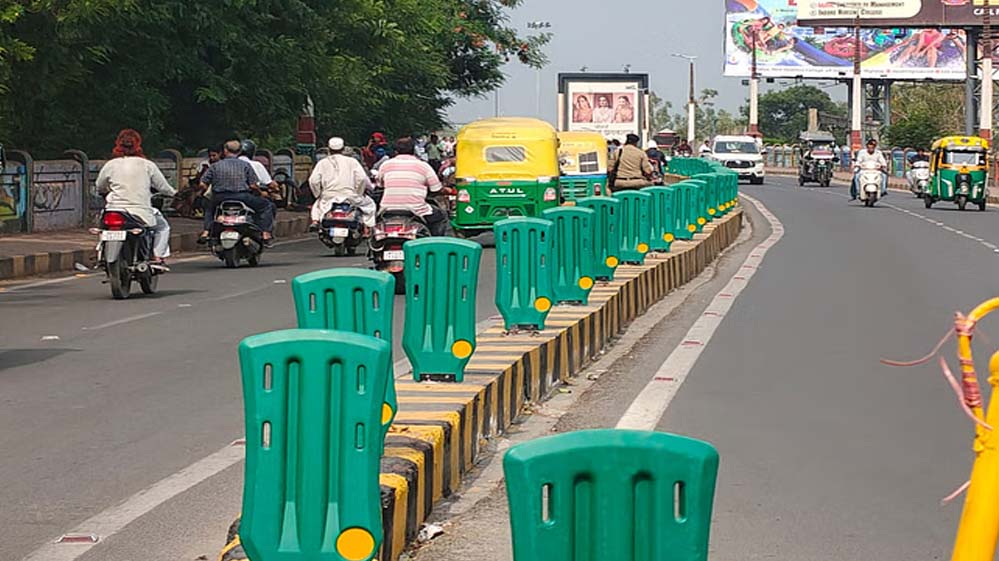 इंदौर के शास्त्री ब्रिज पर नया प्रयोग, लोहे के हटाकर अब प्लास्टिक के डिवाइडर लगाए