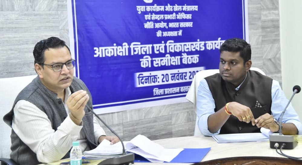 नीति आयोग द्वारा नियुक्त बस्तर जिले के नोडल अधिकारी एवं संयुक्त सचिव शोभित जैन ने बस्तर आकांक्षी जिला और ब्लॉक कार्यक्रमों की प्रगति की समीक्षा बैठक जिला कार्यालय के आस्था सभाकक्ष में ली। बैठक में कलेक्टर हरिस एस ने जिले और ब्लॉक में आकांक्षी कार्यक्रम के अंतर्गत योजनाओं के क्रियान्वयन के संबंध में विस्तृत जानकारी दी और समस्याओं के संबंध में भी अवगत करवाया।