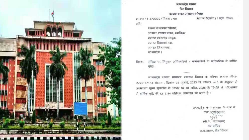 मध्य प्रदेश के लाखों कर्मचारियों को मोहन सरकार ने वेतन वृद्धि का तोहफा दिया है। करीब डेढ़ लाख संविदा अधिकारियों और कर्मचारियों के वेतन में 2.94 प्रतिशत बढ़ाया गया है। संविदा कर्मचारियों को वेतन वृद्धि का लाभ 1 अप्रैल 2025 से मिलेगा।
