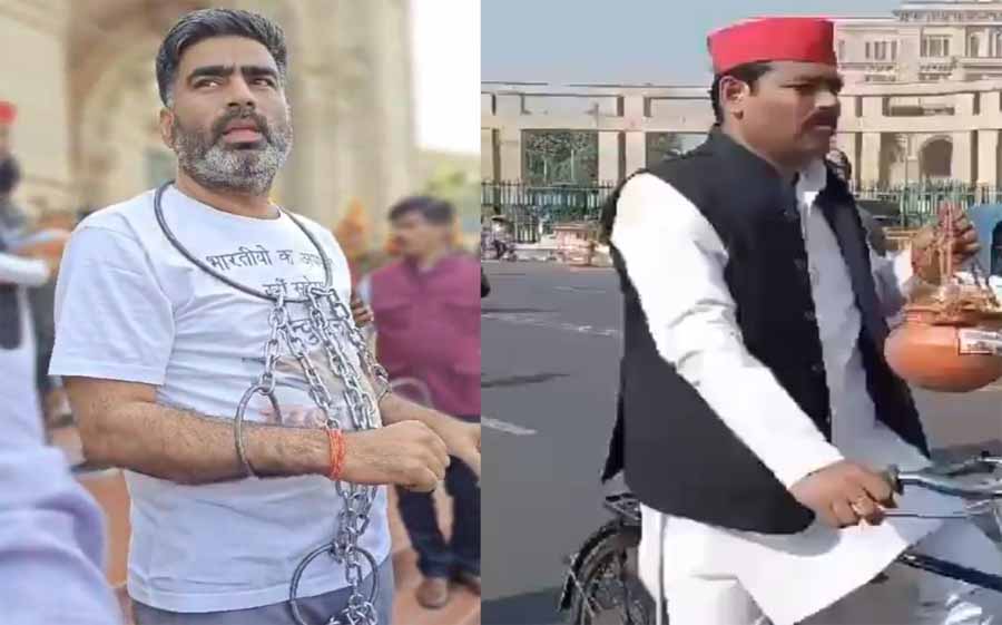 विधानसभा के बाहर समाजवादी पार्टी के विधायक ने बेड़िया पहन किए प्रर्दशन