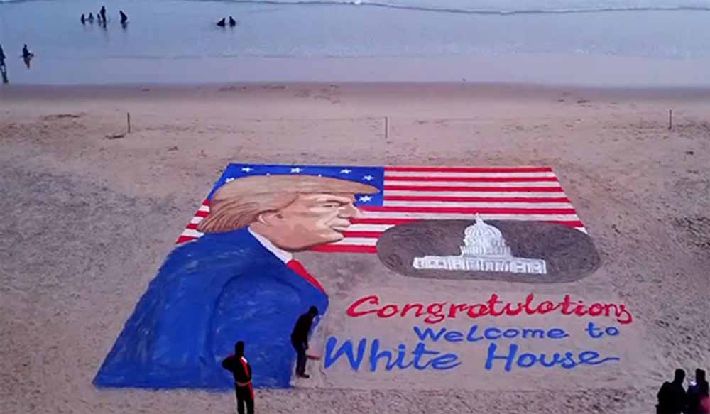 ओडिशा के पुरी बीच पर प्रसिद्ध सैंड आर्टिस्ट सुदर्शन पटनायक ने अमेरिका के नवनिर्वाचित राष्ट्रपति डोनाल्ड ट्रंप के शपथ ग्रहण समारोह से पहले उनकी 47 फीट लंबी सैंड आर्ट बनाई है। इस चित्र पर उन्होंने लिखा "वेलकम टू व्हाइट हाउस"। यह सैंड आर्ट पटनायक ने अपने सैंड आर्ट संस्थान के छात्रों के साथ मिलकर तैयार किया है। ट्रंप सोमवार, 20 जनवरी को अमेरिकी राष्ट्रपति के रूप में शपथ लेंगे। यह चार साल के अंतराल के बाद व्हाइट हाउस में उनकी वापसी होगी। सुदर्शन पटनायक की यह कला अमेरिका के शपथ ग्रहण समारोह से पहले एक महत्वपूर्ण संदेश देती है।
