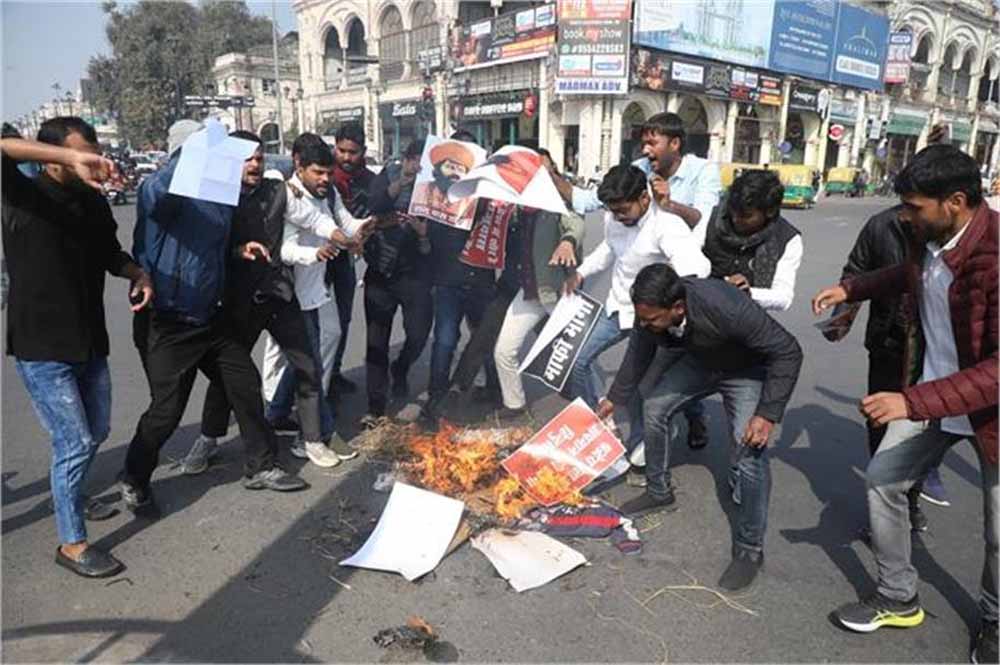 सपा संरक्षक मुलायम सिंह यादव की प्रतिमा का मामला तूल पकड़ रहा, महंत राजू दास का पुतला फूंका