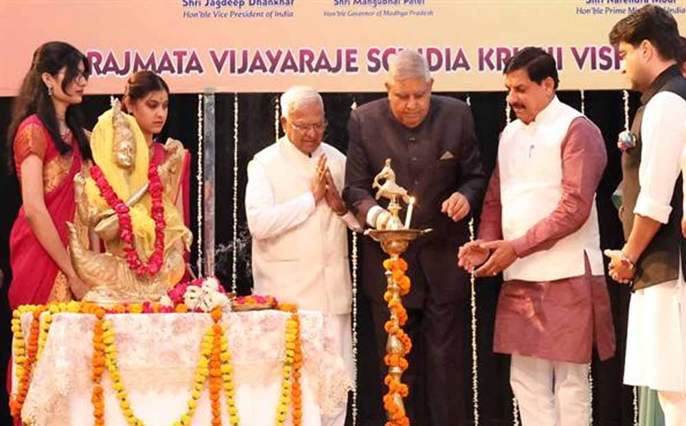 उप राष्ट्रपति जगदीप धनखड़ ने राजमाता विजयाराजे सिंधिया कृषि विश्वविद्यालय ग्वालियर में “प्राकृतिक खेती इकाई एवं मॉडल गौशाला” का लोकार्पण किया। लोकार्पण कार्यक्रम में राज्यपाल मंगुभाई पटेल, मुख्यमंत्री डॉ. मोहन यादव, केन्द्रीय संचार एवं पूर्वोत्तर क्षेत्र विकास मंत्री ज्योतिरादित्य सिंधिया भी शामिल हुए। लोकार्पण के बाद सभी अतिथियों ने यहाँ लगाई गई गौ उत्पादों पर केन्द्रित प्रदर्शनी का अवलोकन किया और गौ-माताओं को चारा खिलाया।