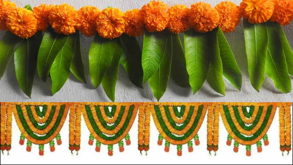 तोरण बनाने के लिए आम के पत्तों का इस्तेमाल करना शुभ माना गया है। इसके साथ ही आप अशोक की पत्तियों का भी इस्तेमाल कर सकते हैं। इसके साथ ही तोरण बनाने में गेंदे का फूलों का भी इस्तेमाल किया जाता है। वास्तु शास्त्र में माना गया है कि तोरण बनाने के लिए आपको 5, 7, 11 या फिर 21 पत्तों का इस्तेमाल करना चाहिए। इसके साथ ही आम के पत्तों पर पीले या लाल चंदन से “शुभ लाभ” जरूर लिखें। इससे सकारात्मक ऊर्जा का संचार बढ़ता है।