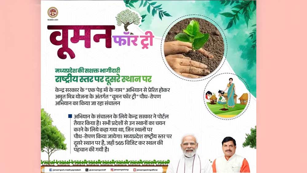 प्रदेश में केन्द्र सरकार के “एक पेड़ माँ के नाम” से प्रेरित होकर अमृत मित्र योजना के अंतर्गत “वूमन फॉर ट्री” पौध-रोपण अभियान का संचालन किया जा रहा है। यह अभियान प्रदेश में 5 जून से 31 अगस्त तक चलाया जायेगा। इस संबंध में नगरीय प्रशासन एवं विकास संचालनालय ने विस्तृत दिशा निर्देश नगरीय निकायों को जारी किये है। यह अभियान अमृत 2.0 योजना एवं डे-एनयूएलएम के कन्वर्जेंस से संचालित किया जा रहा है।